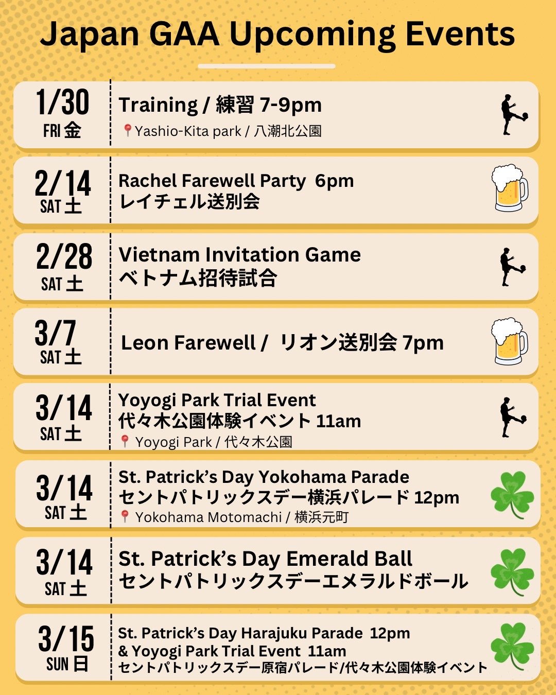 今年も Japan GAA の一年を締めくくる恒例イベントとして、クリスマス会を開催しました。当日は約30名が参加し、国際色豊かなメンバーが一堂に会して、にぎやかで温かい時間を共有しました。 会場ではブッフェ形式の食事を囲みながら、今年一年の活動を振り返り、互いの健闘をねぎらう姿があちこちで見られました。年間40回におよぶ練習を支えてきたメンバーの努力が、改めて実感できる場ともなりました。 イベントのハイライトは、優勝チームの表彰式と MVP アワードの授与です。日頃の練習の成果やチームワークが称えられ、会場は大きな拍手と笑顔に包まれました。 また、運営を支えてくれたコミッティの皆さんへの感謝の気持ちも、改めて共有することができました。日々の調整や準備があってこそ、私たちの活動が成り立っています。 今年も多くの挑戦と成長がありました。来年も Japan GAA らしい活気とつながりを大切にしながら、さらに充実した活動を続けていきましょう!